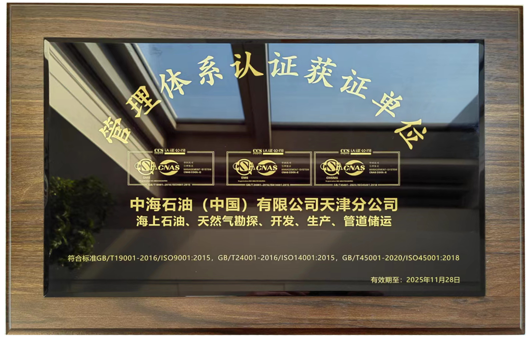 近日,中國船級社質(zhì)量認(rèn)證有限公司(CCSC)順利完成中海石油(中國)有限公司天津分公司(以下簡稱“中海油天津分公司”)質(zhì)量管理體系、環(huán)境管理體系、職業(yè)健康安全(QHSE)管理體系認(rèn)證審核工作,并為其頒發(fā)了QHSE管理體系認(rèn)證證書。