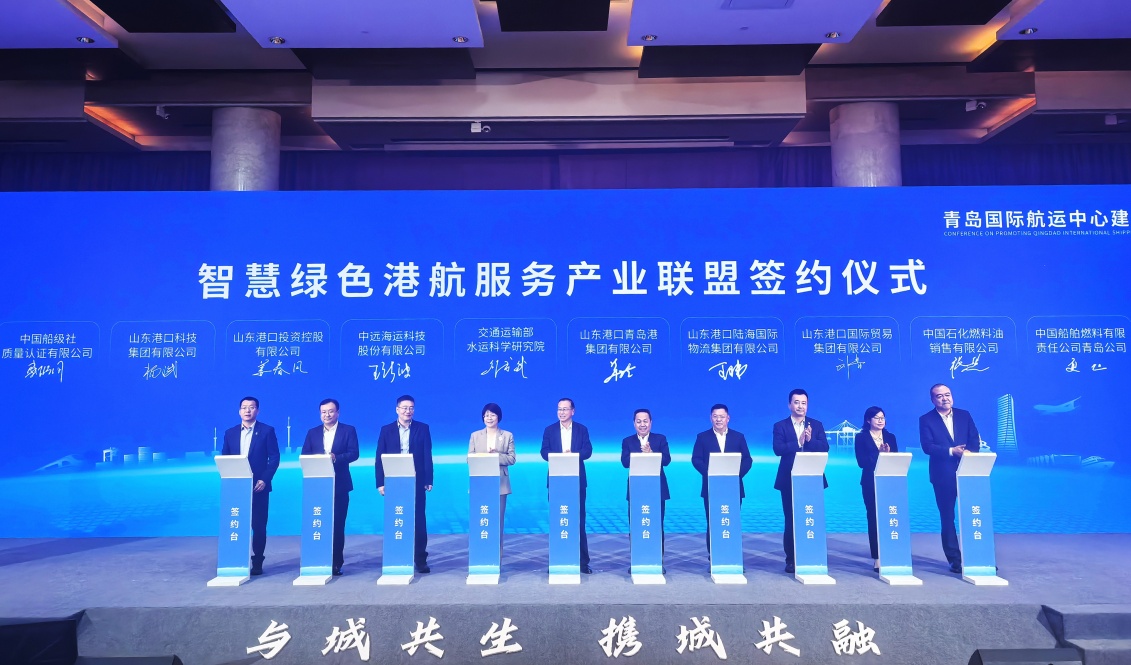 會(huì)上, CCSC與山東港口青島港集團(tuán)、山東港口投控集團(tuán)、山東港口物流集團(tuán)、山東港口貿(mào)易集團(tuán)、山東港口科技集團(tuán)、交通運(yùn)輸部水運(yùn)科學(xué)研究院、中國(guó)船舶燃料有限責(zé)任公司青島公司、中國(guó)石化燃料油銷售有限公司、中遠(yuǎn)海運(yùn)科技股份有限公司共同簽約成立智慧綠色港航服務(wù)產(chǎn)業(yè)聯(lián)盟。聯(lián)盟將依托各方在智慧綠色航運(yùn)領(lǐng)域良好的業(yè)務(wù)基礎(chǔ)和資源優(yōu)勢(shì),以項(xiàng)目為牽引,集聚港航資源、優(yōu)化港航要素、升級(jí)服務(wù)業(yè)態(tài),加強(qiáng)產(chǎn)業(yè)內(nèi)的合作與交流,共同推進(jìn)技術(shù)創(chuàng)新、應(yīng)用示范和產(chǎn)業(yè)升級(jí),加快項(xiàng)目落地見效,積極助力青島國(guó)際航運(yùn)中心建設(shè),服務(wù)經(jīng)濟(jì)社會(huì)高質(zhì)量發(fā)展。