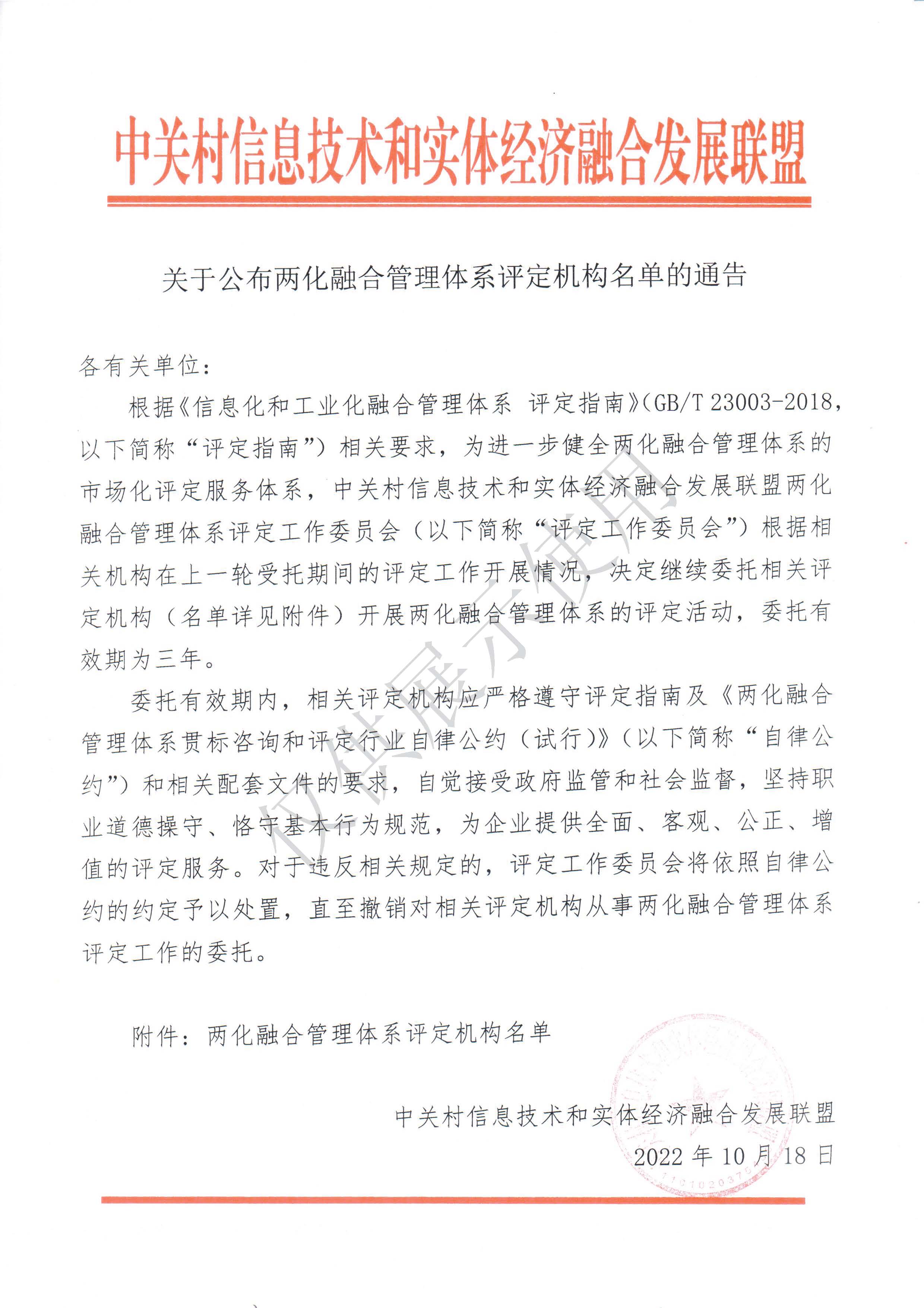 關(guān)于公布兩化融合管理體系評(píng)定機(jī)構(gòu)名單的通告