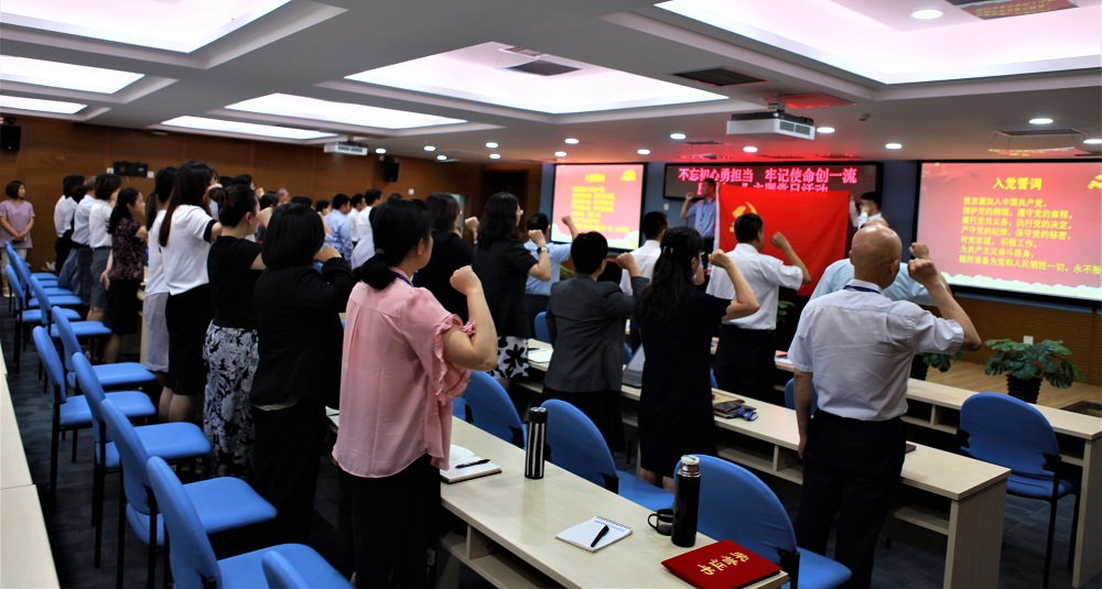 隨后,黨委組織委員黃學(xué)良同志帶領(lǐng)兩名新黨員——楊文宇同志、王丹同志面對(duì)黨旗進(jìn)行入黨宣誓儀式,全體黨員一起重溫入黨誓詞,不忘入黨初心,牢記黨員使命,接受思想的再洗禮。