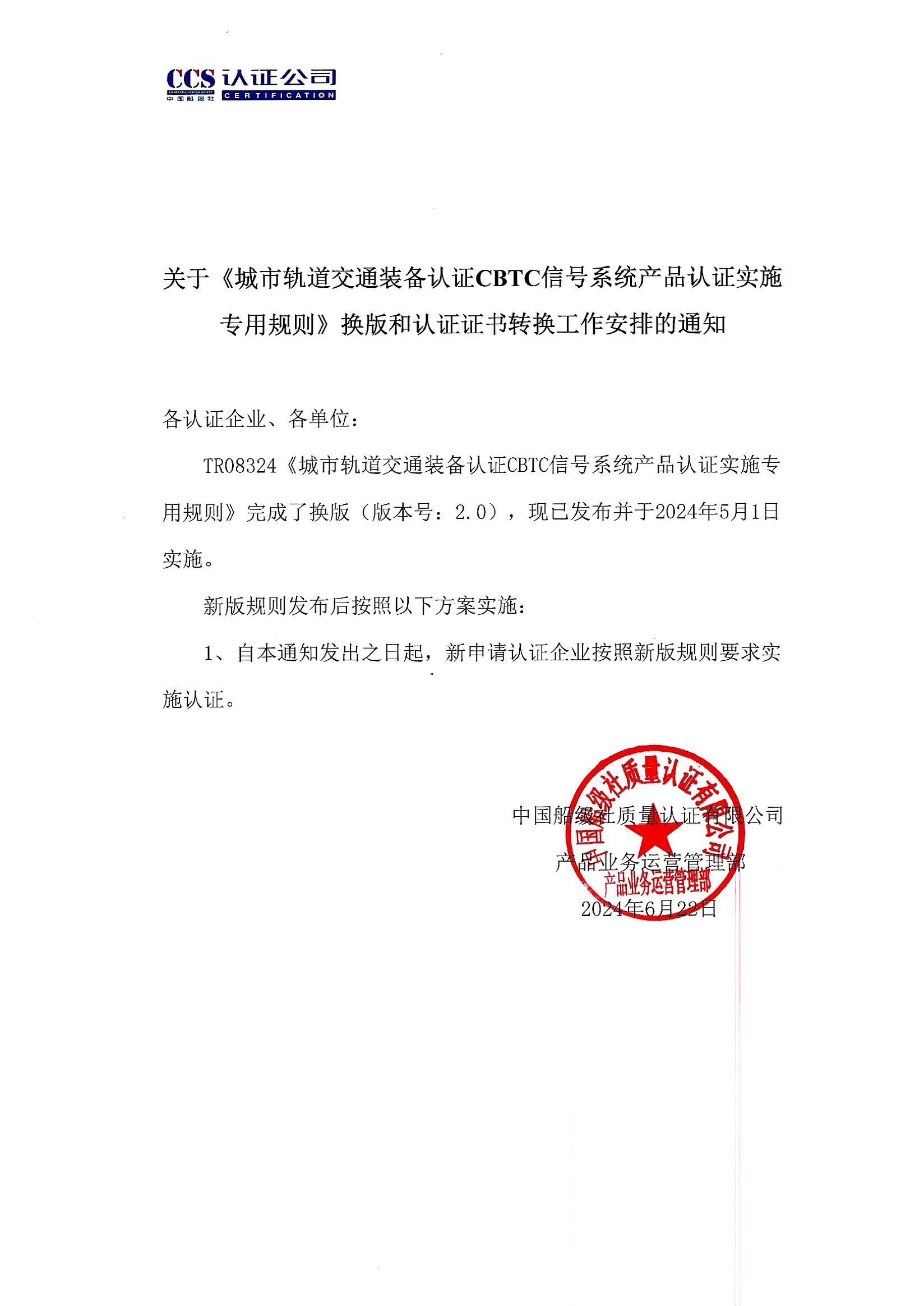 關(guān)于《城市軌道交通裝備認證CBTC信號系統(tǒng)產(chǎn)品認證實施專用規(guī)則》換版和認證證書轉(zhuǎn)換工作安排的通知
