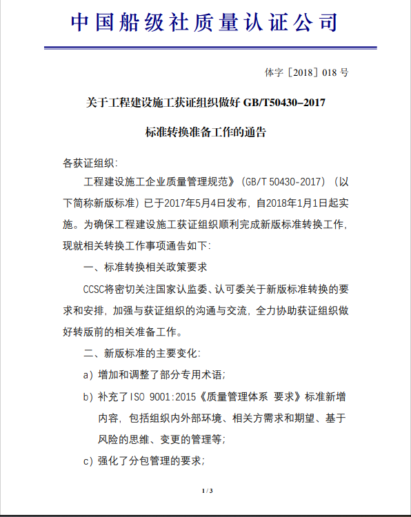 關(guān)于工程建設(shè)施工獲證組織做好GBT50430-2017標(biāo)準(zhǔn)轉(zhuǎn)換準(zhǔn)備工作的通告