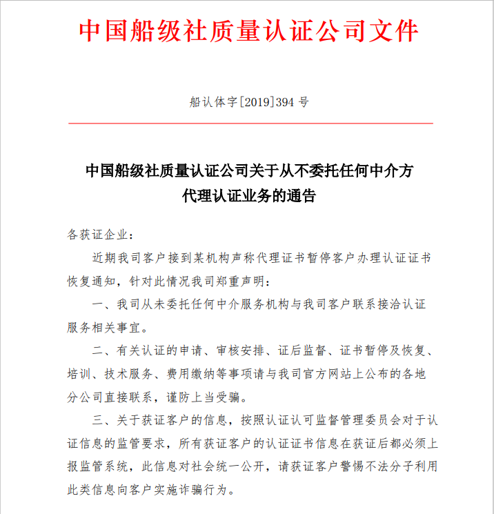 中國(guó)船級(jí)社質(zhì)量認(rèn)證有限公司關(guān)于從不委托任何中介方代理認(rèn)證業(yè)務(wù)的通告