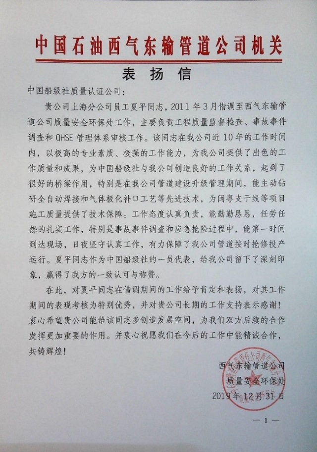 近日,我司收到中國(guó)石油西氣東輸管道公司發(fā)來(lái)的表?yè)P(yáng)信,充分肯定了上海分公司夏平同志的工作表現(xiàn)。夏平同志在西氣東輸管道公司質(zhì)量安全環(huán)保處,開(kāi)展質(zhì)量管理監(jiān)督、事故事件調(diào)查等工作,工作期間,主動(dòng)維護(hù)客戶關(guān)系,努力拓展業(yè)務(wù),爭(zhēng)取到多項(xiàng)西氣東輸相關(guān)服務(wù)項(xiàng)目